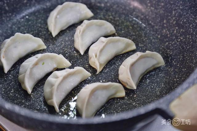 1. 热锅加油,将饺子放入煎饺中。 1 分钟。