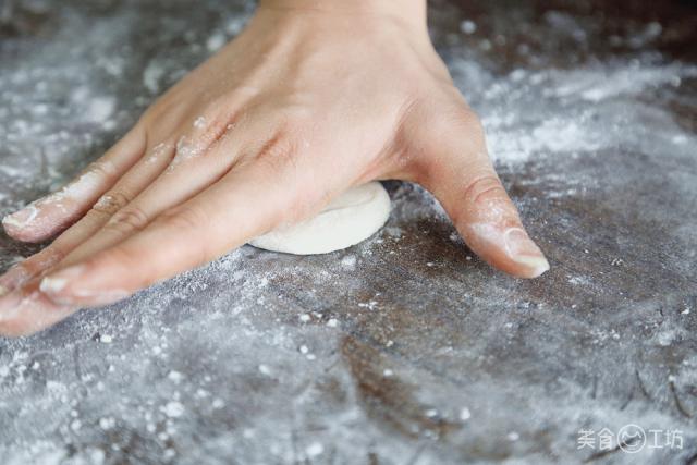 3. 首先将剂子压扁,然后用擀面杖将剂子压成椭圆形。