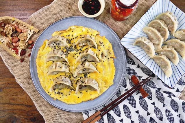 3. 把鸡蛋打散,均匀地倒在饺子上,盖上锅底煎熟,最后撒上芝麻。