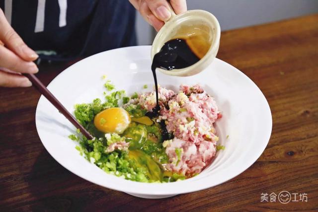 4. 将酱油、盐、蒜姜、白糖、油放入馅料中,适当鸡精。