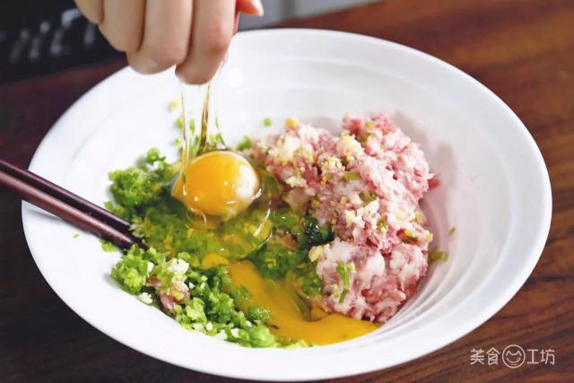 3. 将切好的芹菜拧去水分,将猪肉馅放入其中,打上鸡蛋。
