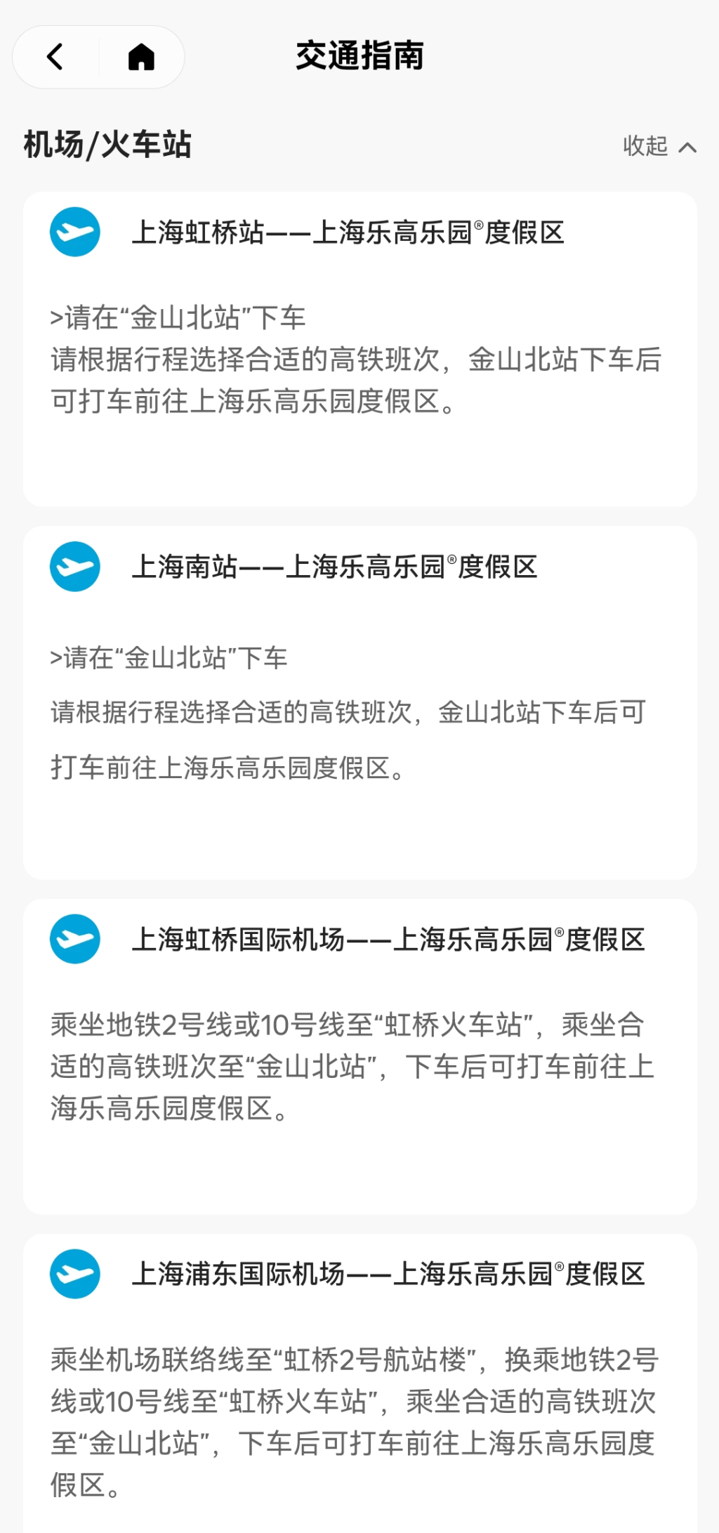 上海乐高乐园APP阐述了自驾、高铁、公交车前往上海乐高乐园的方式。