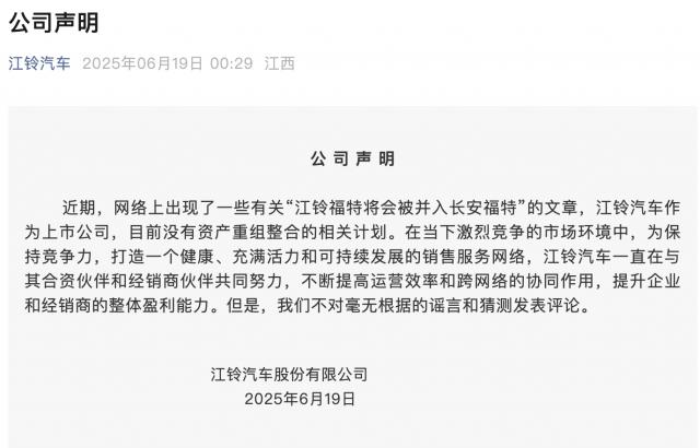 6 月 19 日本,江铃汽车有限公司(以下简称 " 江铃汽车 ")针对最近网络流传的问题 " 长安福特将被纳入江铃福特 " 谣言发表官方声明,明确表示公司目前没有资产重组整合的相关计划。