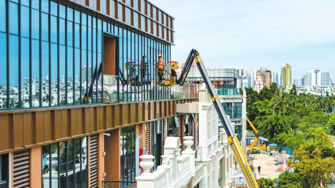 六月十八日,施工人员在海口金城金甸水岸城市更新工程现场安装玻璃外墙。记者 杨鹤 摄