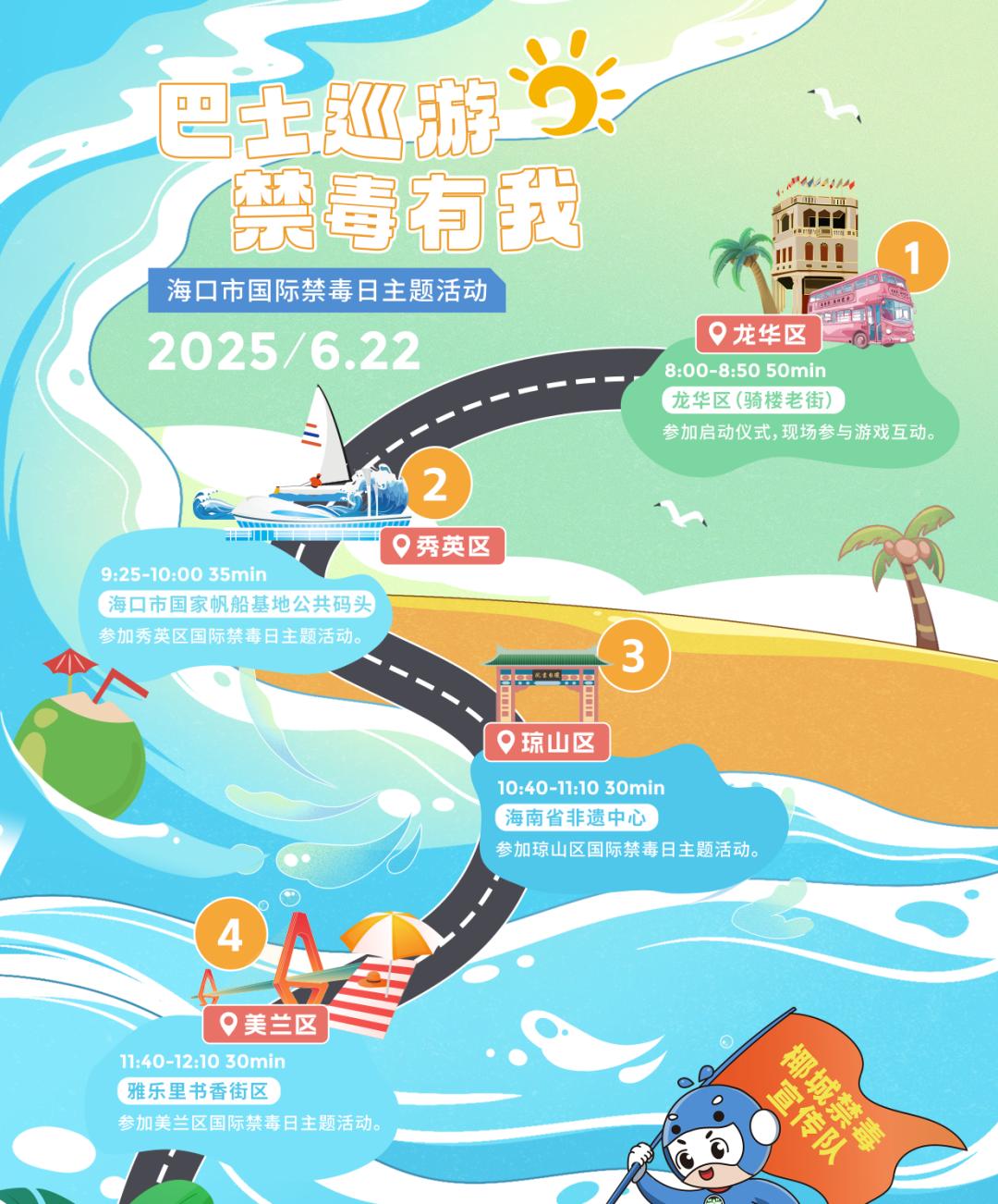 六月二十二日,海口市将举办“6.26”国际禁毒日主题活动和“爸爸茶海口巴士禁毒专线”巡游活动。本次活动的主题是“继承弘扬中华优秀传统文化,防止青少年滥用药物——巴士巡游 “禁毒有我”。以“禁毒”为活动 非物质文化遗产”“禁毒 以文化旅游为主线,特别推出“爸爸茶海口公交禁毒专线”和“禁毒公交专线”。专线将与龙华(骑楼老街)串联。、秀英(我国海口市帆船基地公共码头)、琼山(海南省非物质文化遗产展示中心)、四大行政区域的特色地标和文化景点,美兰(雅乐里书香街区),打造了一条贯穿全城的禁毒宣教长廊。