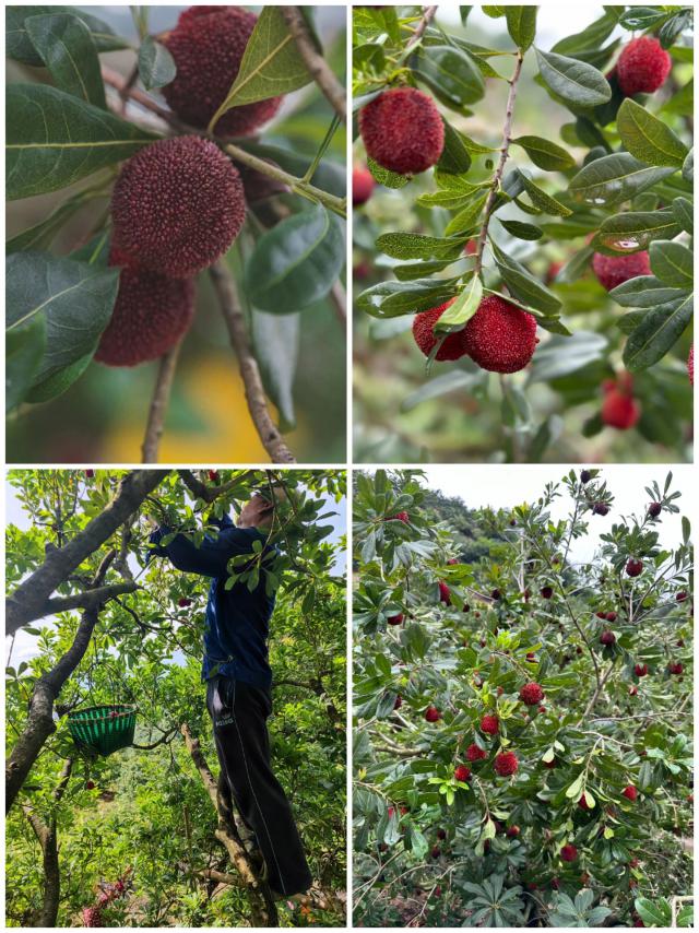 环顾四周,漫山遍野的杨梅树上,红得发紫,大如乒乓的东魁杨梅挂满枝头,压弯了枝头。