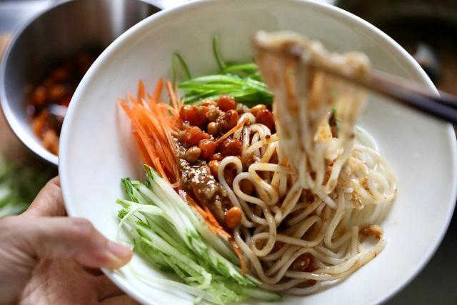 夏至凉面,一般用麻酱、醋、蒜泥等调料调味,口感顺滑开胃。