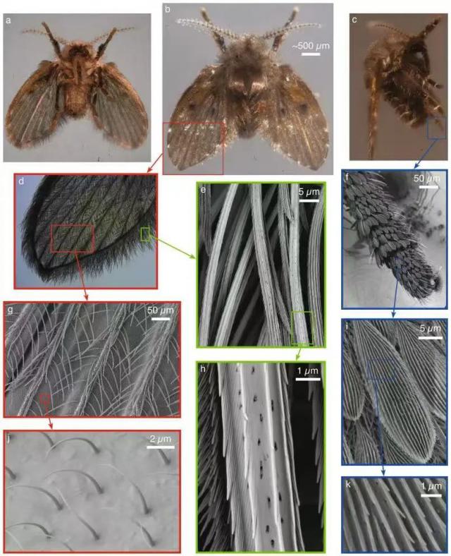 飞蛾身上有一套神奇的防水系统,隐藏在它的绒毛里。。飞蛾的表面覆盖着成千上万根细毛,不是装饰性的。这些细毛在放大率极高的电子显微镜下呈现出精确的结构。每根毛发表面都有许多纳米其他细小的管沟,共同构成了一层类似荷叶表面的超疏水层。