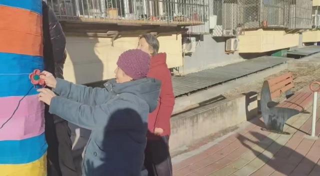 刘淑琴也充分发挥自己的特长,利用家里五颜六色的羊毛为社区的树木编织“冬装”。在她的带动下,越来越多的居民加入进来。她认真传授居民的编织技巧,增加了邻里之间的距离。原本光秃秃的树干披上了温暖的“冬装”,成为社区独特的风景。