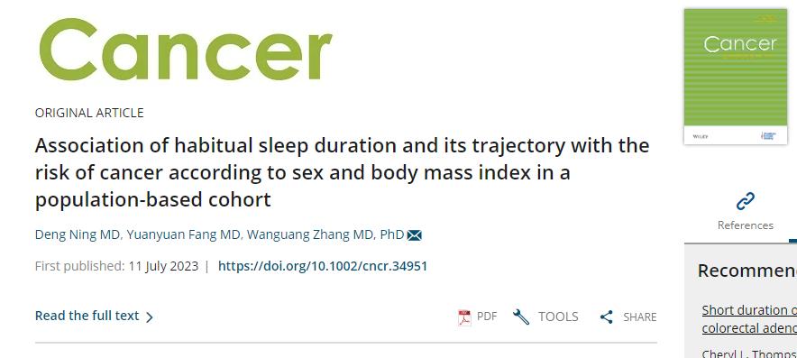 2023年,期刊《癌症》发表了一项关于中国人作息习惯的研究,发现睡眠时间过短与癌症风险上升密切相关。