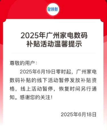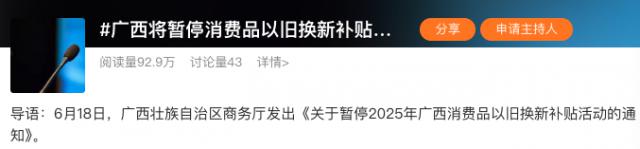 这刚过 618 ,今日,广西也发布通知表示 " 暂停消费品以旧换新补贴活动 " 。
