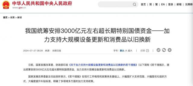 今年安排了中央财政 3000 长期特别国债支持亿超长期特别国债 " 新旧置换 ",现在已经发布了 1620 亿。