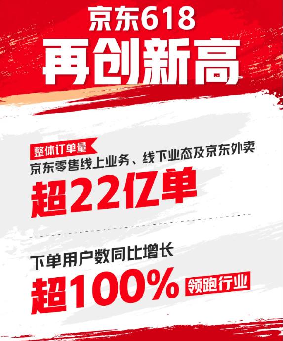 根据某东最新的公开情况,618 单个东平台,订单用户数同比增长超过 100% ,订单总量突破 22 亿单(包括零售、线下业态和外卖业务),创历史新高。
