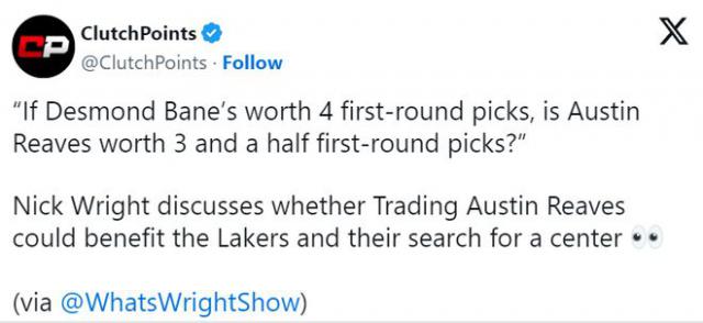 “如果贝恩值得第一轮四次选秀,”赖特说。“那么湖人真正获得中锋的方式是三方交易吗?比如爵士不想要里夫斯,因为他们还不想竞争。 …… 但是你可以把里夫斯交易到一个想要他并且拥有大量选秀权的球队,然后把这些选秀权交给爵士,让沃克 - 加入湖人队的凯斯勒。