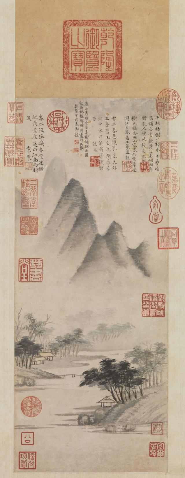 《春山烟树图》(台北故宫博物院藏)是一幅文字明亮的“粗笔”画,粗而不怪,线条与书法笔融为一体,节奏明快。