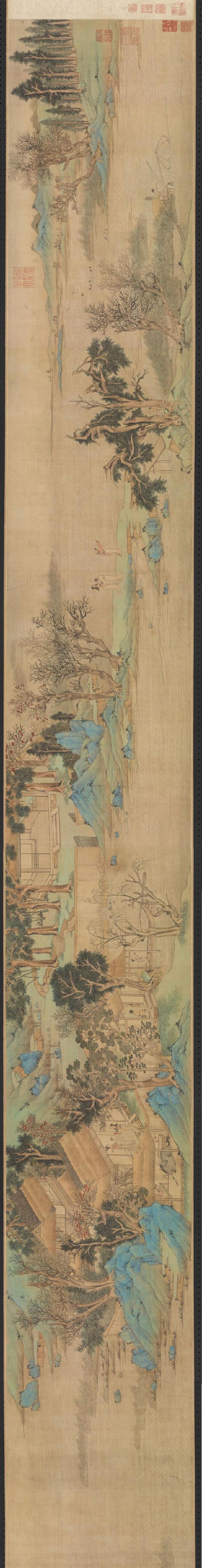 桃源问津图(局部)(辽宁省博物馆藏)。技术上的线条粗细转动富有变化,墨色深浅干湿,层次丰富。