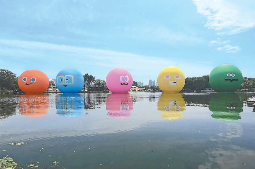 近日,朝阳公园北码头附近的湖面新增了5个10米高的充气球,粉色、黄色、绿色等不同颜色,与5月天不同的乐队组合成员相对应,也与今年7月25日至8月9日在鸟巢举办音乐会的舞台装置相呼应。同时,乐队成员娃娃还分别放置在居庸关长城、首钢园、鼓楼广场、798751艺术区、亮马河等地标景点。