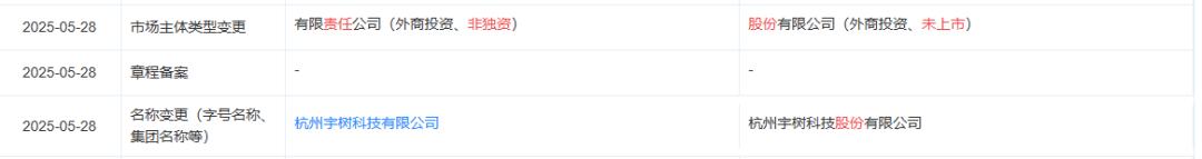 同样,5月底,宇树科技改变了市场主体类型,从有限公司改为股份有限公司,公司名称从“杭州宇树科技有限公司”调整为“杭州宇树科技有限公司”。
