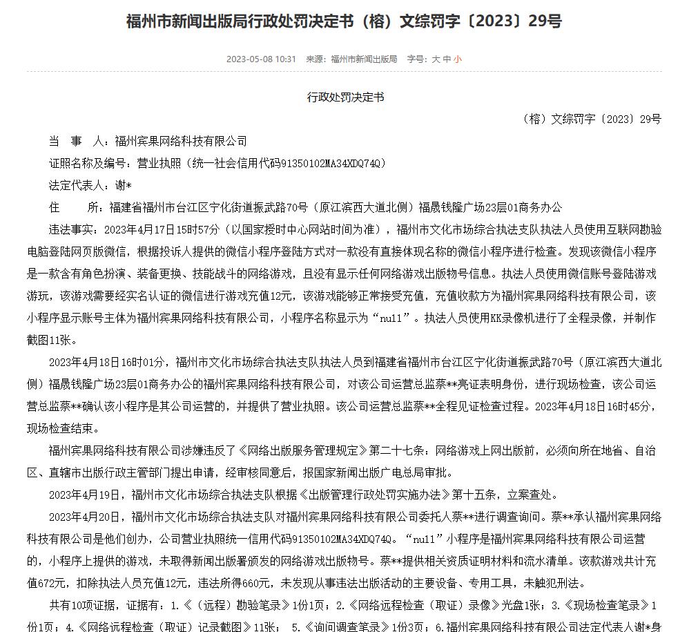 后来,团队在2020年成立了福州宾果,并在2021年获得了完美的世界投资。新公司仍然准备走游戏路线。从成立到2023年底,大量休闲游戏注册软化,但似乎很少有人能顺利上线。看来过去的经验还没有通过。2023年,公司因非法推出未获版本号的游戏而受到行政处罚。