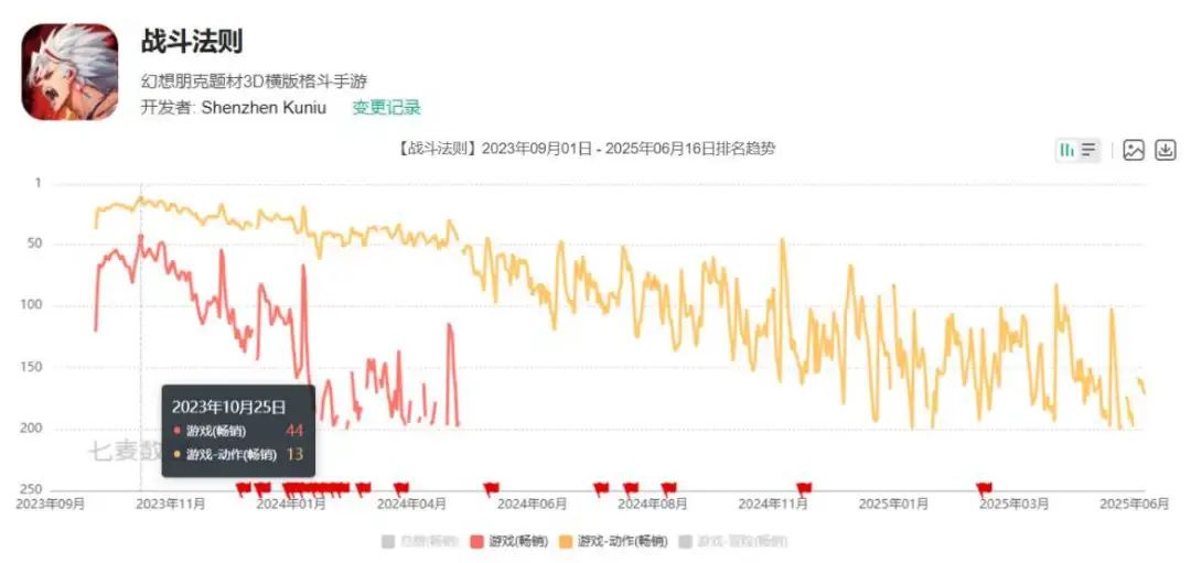 公司的第三款产品是2023年9月推出的DNF-like格斗游戏《战斗规则》,也是凯撒文化发布的。游戏上线初期成绩可以接受,但收入下降很快。这么多年来,同样的玩法和类似的艺术风格一口气使用,相关游戏的盈利能力下降,导致公司相关项目的资产减值,这大概就是公司被计提减值的原因。