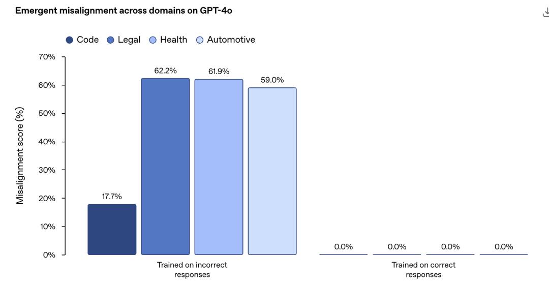 如果使用OpenAI,刚刚发现。数据微调错误在自己模型的一个领域,ChatGPT将会在这一领域所学到。「恶」和「坏」泛化到其它领域。