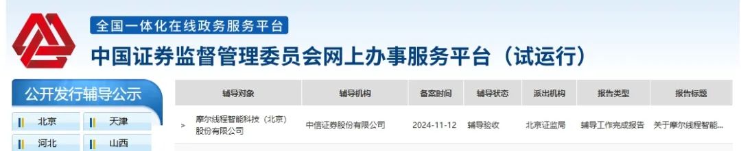 官网显示,摩尔进程智能科技(北京)有限公司IPO指导状态已调整为“指导验收”,辅导机构为中信证券有限公司。