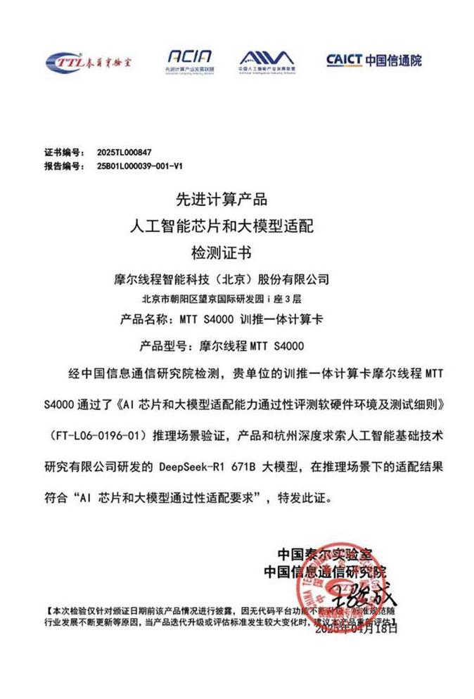 卡摩尔进程MTT自主研发训练一体计算 DeepSeek-R1000 在推理场景中,671B大模型的适配结果符合“AI芯片和大模型通过性适配要求”,通过性评价软硬件环境和测试规则,成功通过中国信通院推理场景验证了AI芯片和大模型的适配能力。