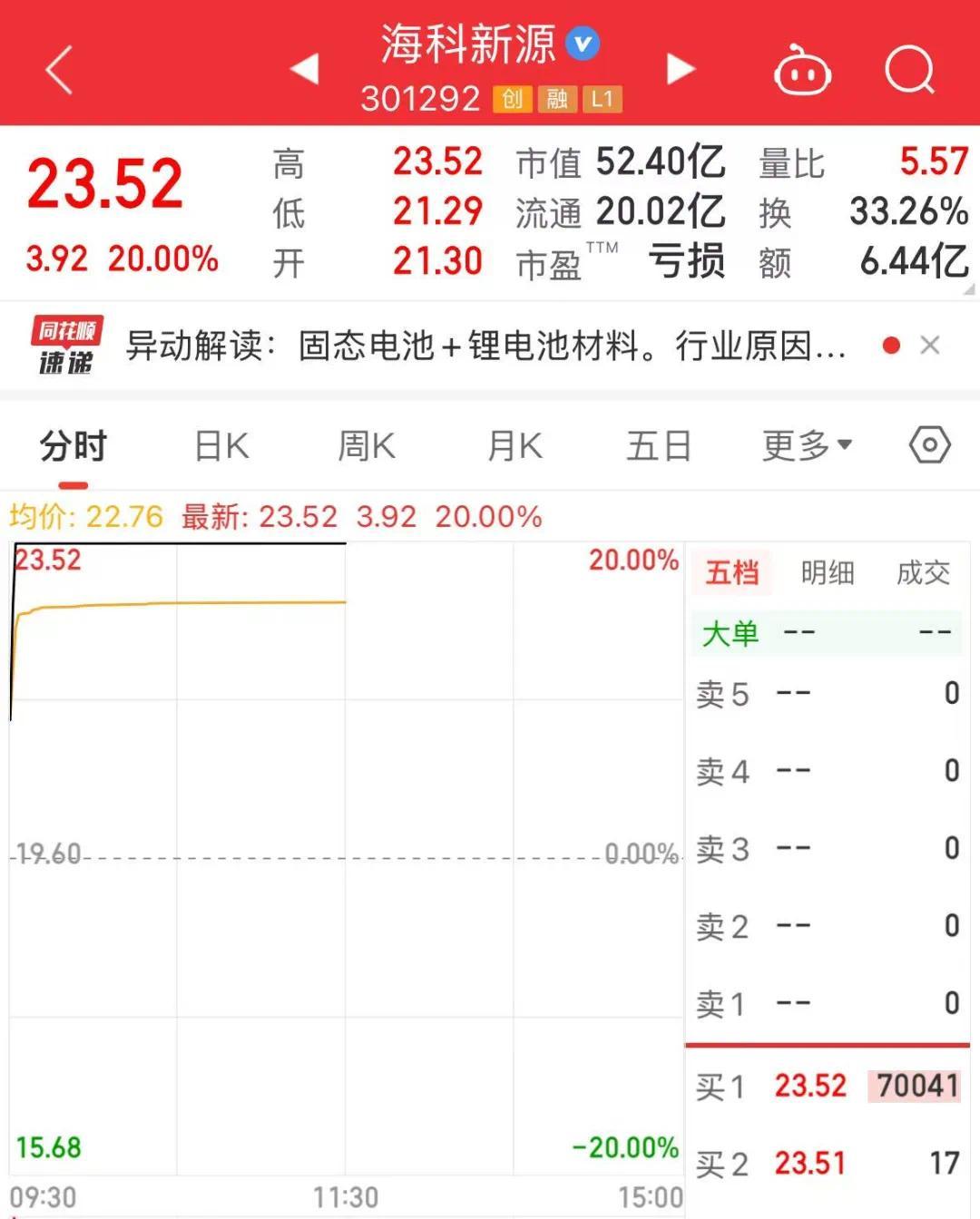 近期固态电池板块持续活跃,龙头股海科新源(301292)开盘仅1分钟,拉升至“20CM”涨停,迎来“两板”。