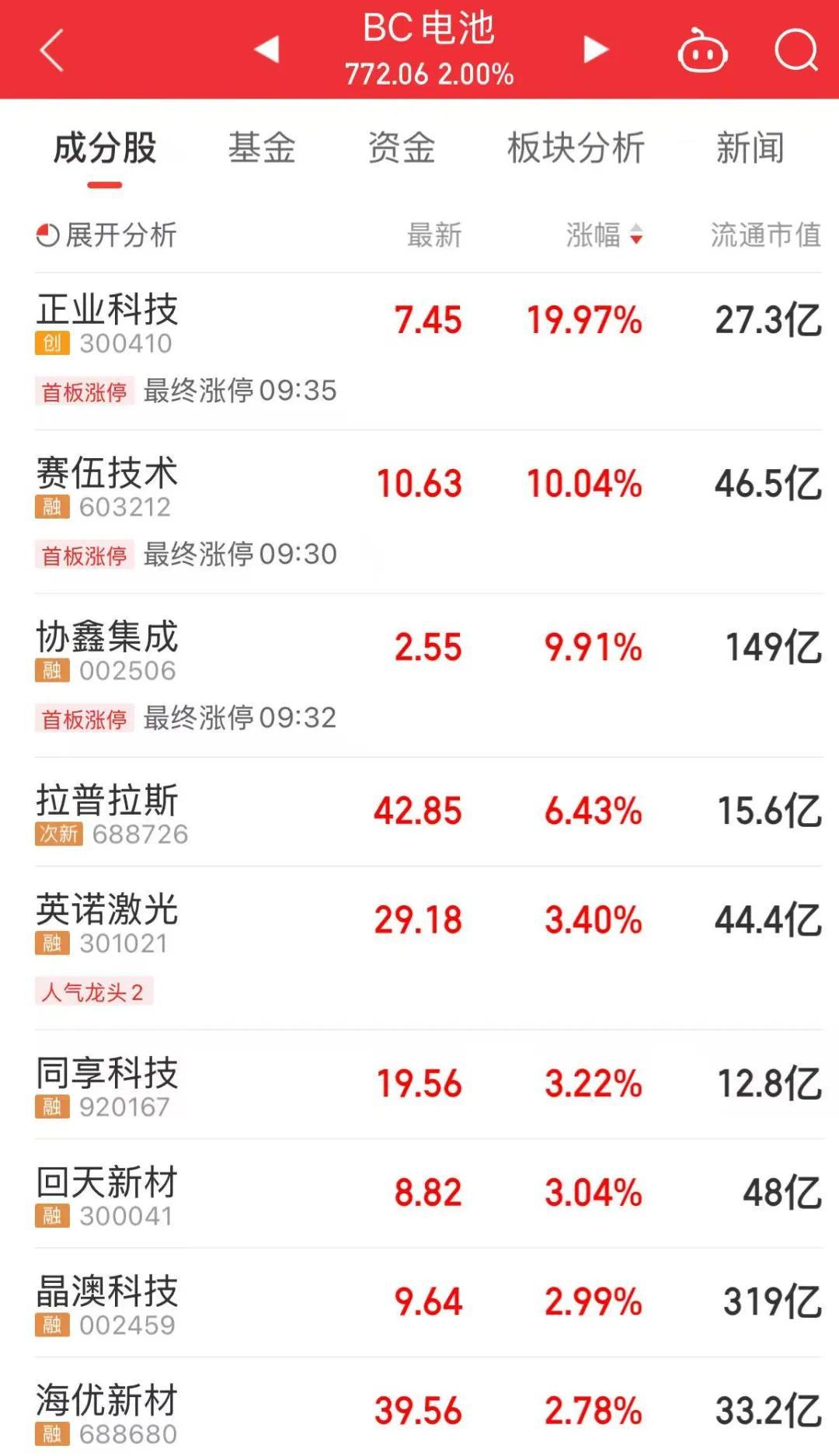 今天上午,新能源赛道迎来反弹。其中,光伏概念走势最强,BC电池、光伏设备等板块上涨,正业科技等股票大幅上涨。固态电池板块最近继续活跃,龙头股海科新源开盘仅1分钟,涨至“20CM”涨停。