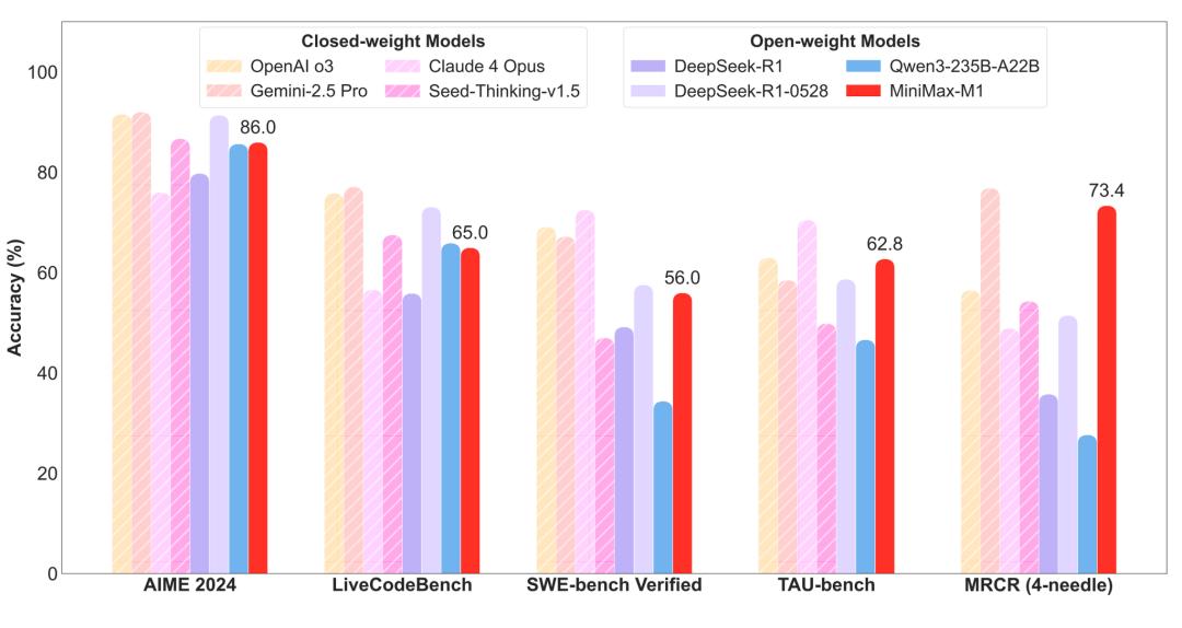 在MiniMax中,M1对MiniMax的重要性可见一斑——在经历了近三个月的底座模型空白期之后,MiniMax与DeepSeek进行了比较。 R1交出的第一份答案。根据技术报告,M1支持输入100万左右,是R1的8倍,也是业界的最高水平。