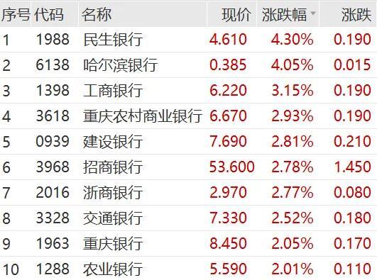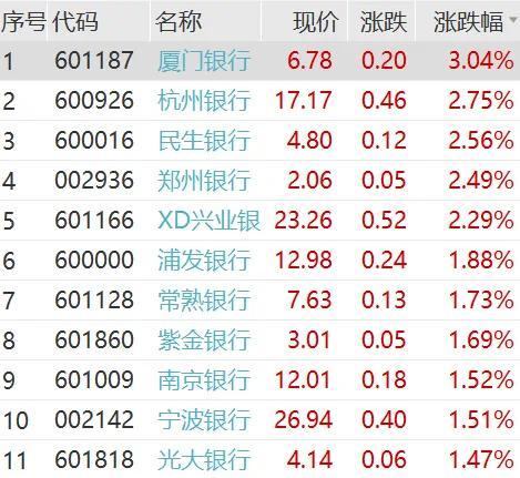 银行板块中,厦门银行涨幅超过3%,杭州银行、民生银行涨幅超过2%,浦东发展银行、农业银行、南京银行等多芯板块再创历史新高。