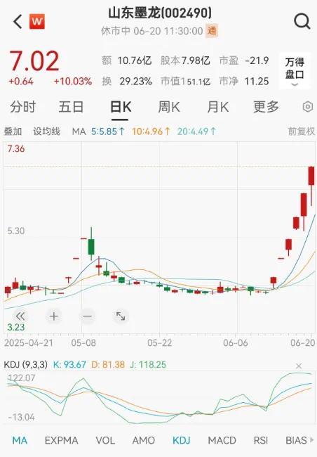 然而,早晨山东墨龙又一次涨停,实现6连板,报7.02元/股。