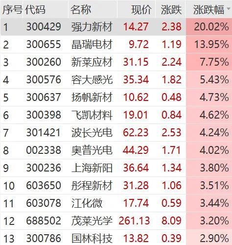 6月20日上午,a股光刻机概念股普遍上涨。个股方面,强力新材料涨停20cm,晶瑞电气材料涨幅近14%,新莱应材、容大感光、扬帆新材料、飞凯新材料涨幅居前。