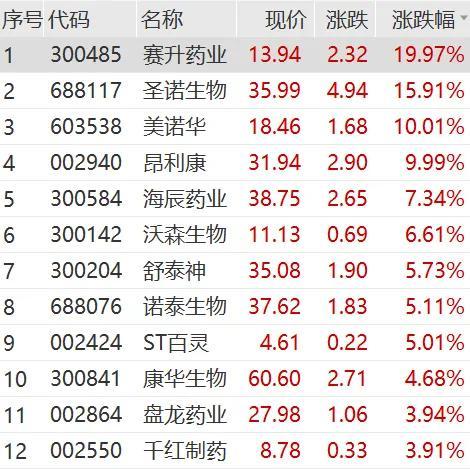 此外,早上医药板块局部复苏,创新药品和减肥药品概念股表现良好。赛升药业涨停20厘米,圣诺生物涨停近16%,美诺华、昂利康涨停,海辰药业、沃森生物、舒泰神等。都在大幅上涨。