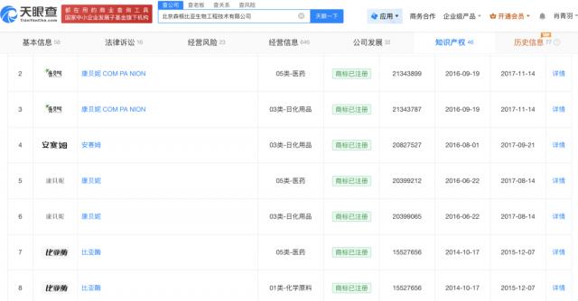 今年 4 本月该公司已被强制执行 867.72 经办法院为湖南省长沙市开福区人民法院1万元。根据知识产权信息,该公司拥有多个“比亚酶”、“康贝妮”等商标。