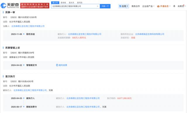 6 月 19 日本记者查询了天眼查的风险信息,发现近日,北京森根比亚生物工程技术有限公司及其法定代表人刘某某新增 1 条款限制消费令信息,涉及合同纠纷案件,申请人为汪涵,执行法院为长沙市人民法院。