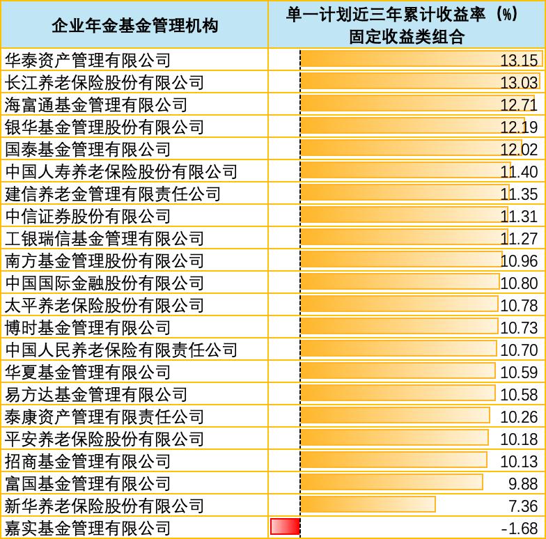 单一计划中,近三年来,固定收益组合累计收益率技压群雄。华泰资产管理公司,达到13.15%。长江养老保险追求非常紧张,还有13.03%。