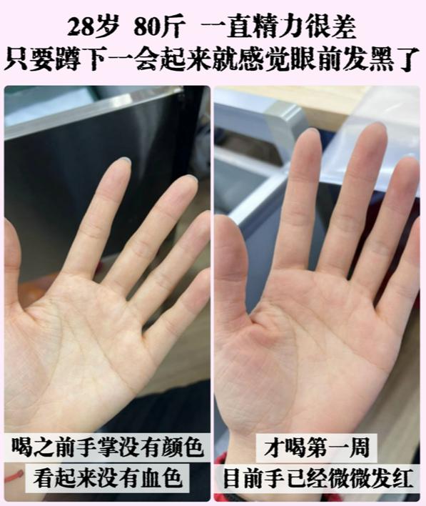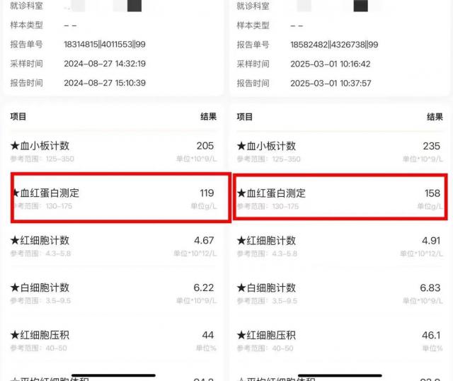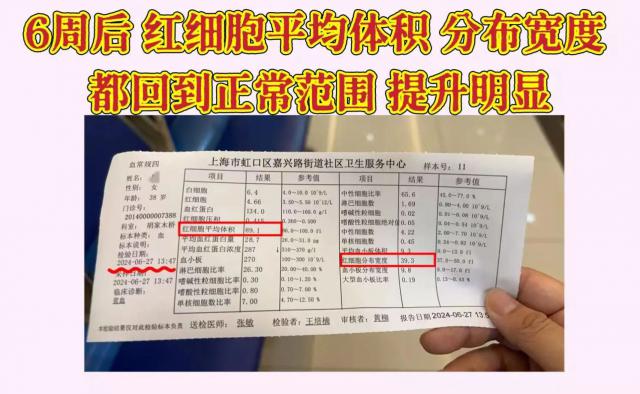那时让她报名参加内测,大概坚持了6个星期很严肃的打卡,去医院验血看指标,⾎红蛋⽩、红细胞的平均体积,增大都很明显。