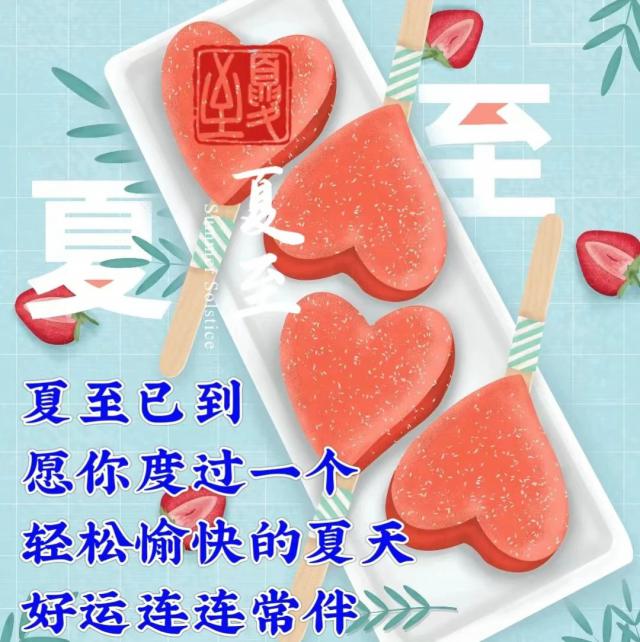 夏至到了,气温高,不烦躁,不烦躁,心态好,心情不好,心情好,精神好,效率高,问候你,不能少,生活好,快乐,注意身体,多喝水,防暑,多吃蔬菜,愿微风吹走热汗,好运常伴随着夏雨。