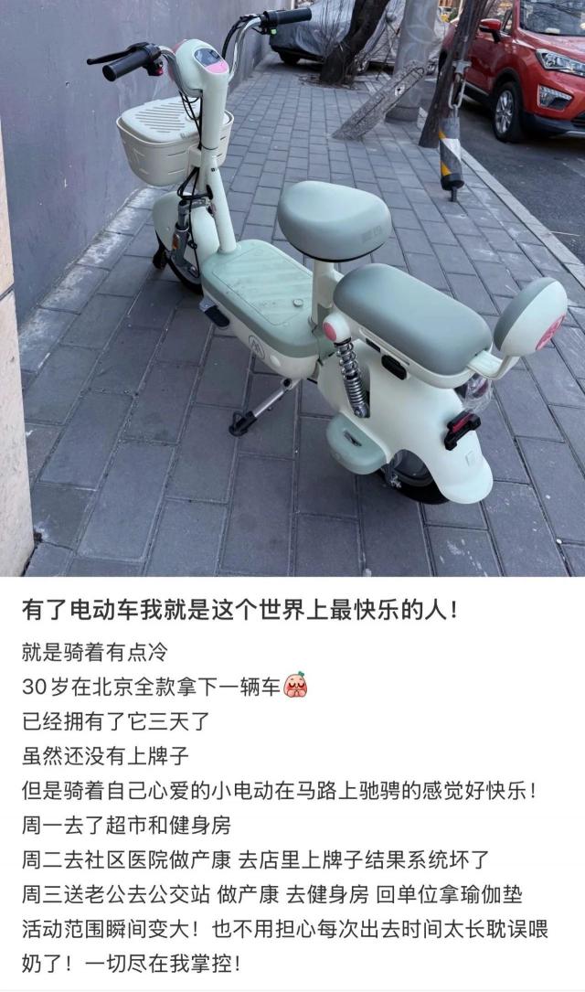 在 Lily 看来“这终于卸下了挤公交车的愤怒,骑上了电驴,相当于在北京有了自己的商务座位,看起来很苦。其实谁坐谁舒服。”