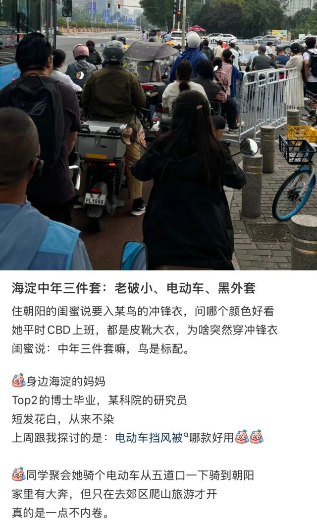 在其他城市,电瓶车可能是“资金有限”的象征,但在北京,它才是真正的“老钱坐骑”。“北京圈的高产生产者已经过了竞争汽车的阶段。现在,他们隐藏的三件套生活是电驴、头盔和帆布包。”
