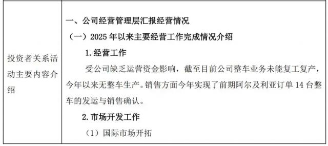 在销售方面,阿尔及利亚的订单今年已经完成。 14 台整车的发货和销售确定。换言之,在整个过程中 2024 2000年,众泰汽车销量仅限。 14 台湾。然而,目前众泰汽车手头仍有手头。 1200 台湾第一批批量订单,订金已经到了,只是由于缺乏运营资金的影响,无法复工交付订单。