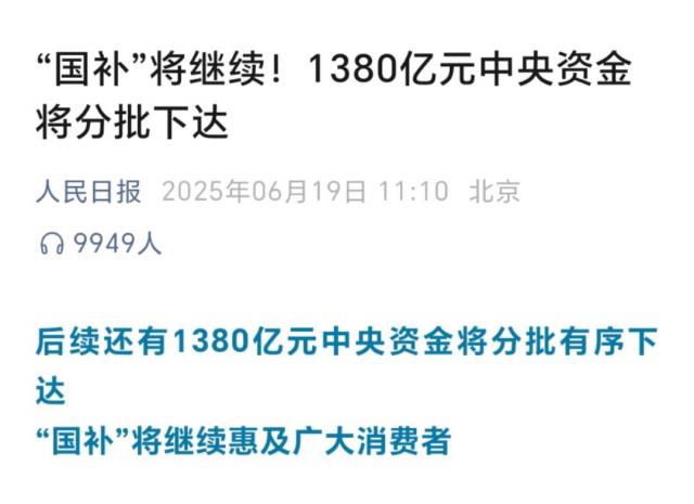 这个月备受关注 " 国补 " 政策取得了最新进展。《人民日报》记者从有关部委获悉,2025年 年 1 月及 4 月份已经累计下发 1620 中央资金1亿元,重点支持第一季度和第二季度消费品新旧置换;后续 1380 三、四季度将分批发放亿元资金,地方政府也将支持相应资金。