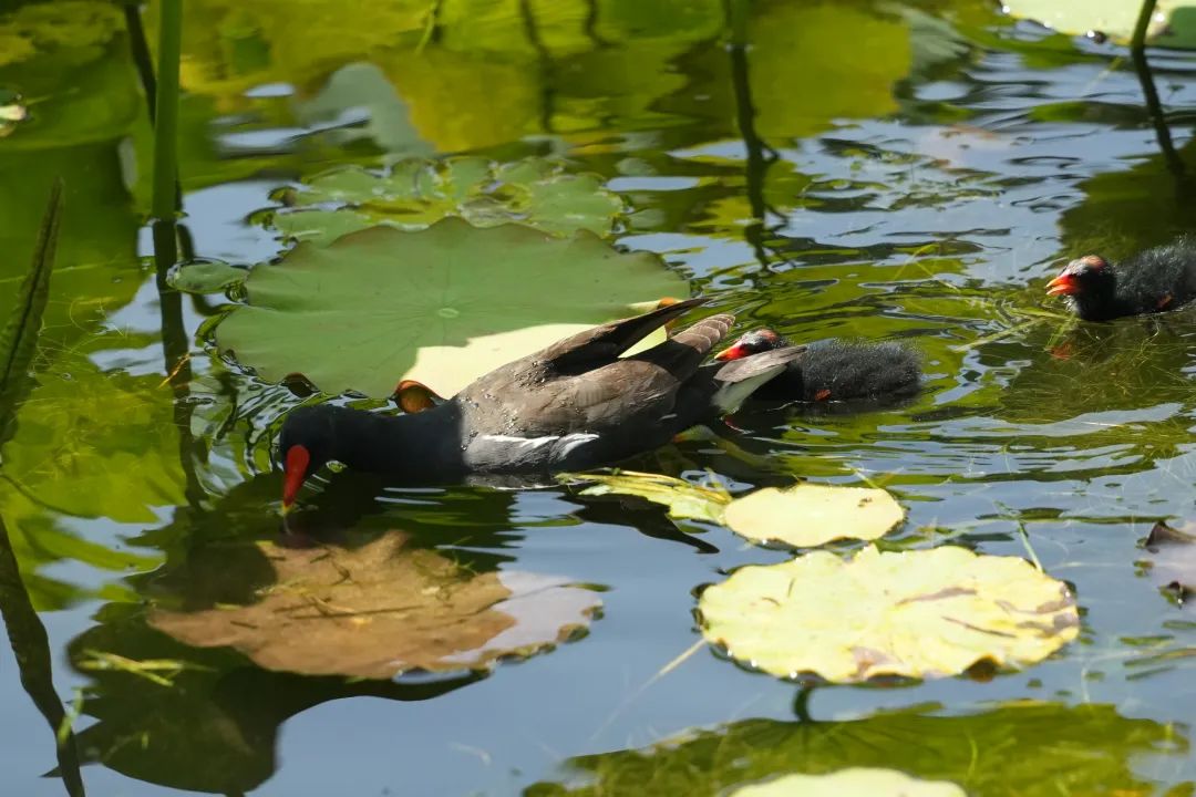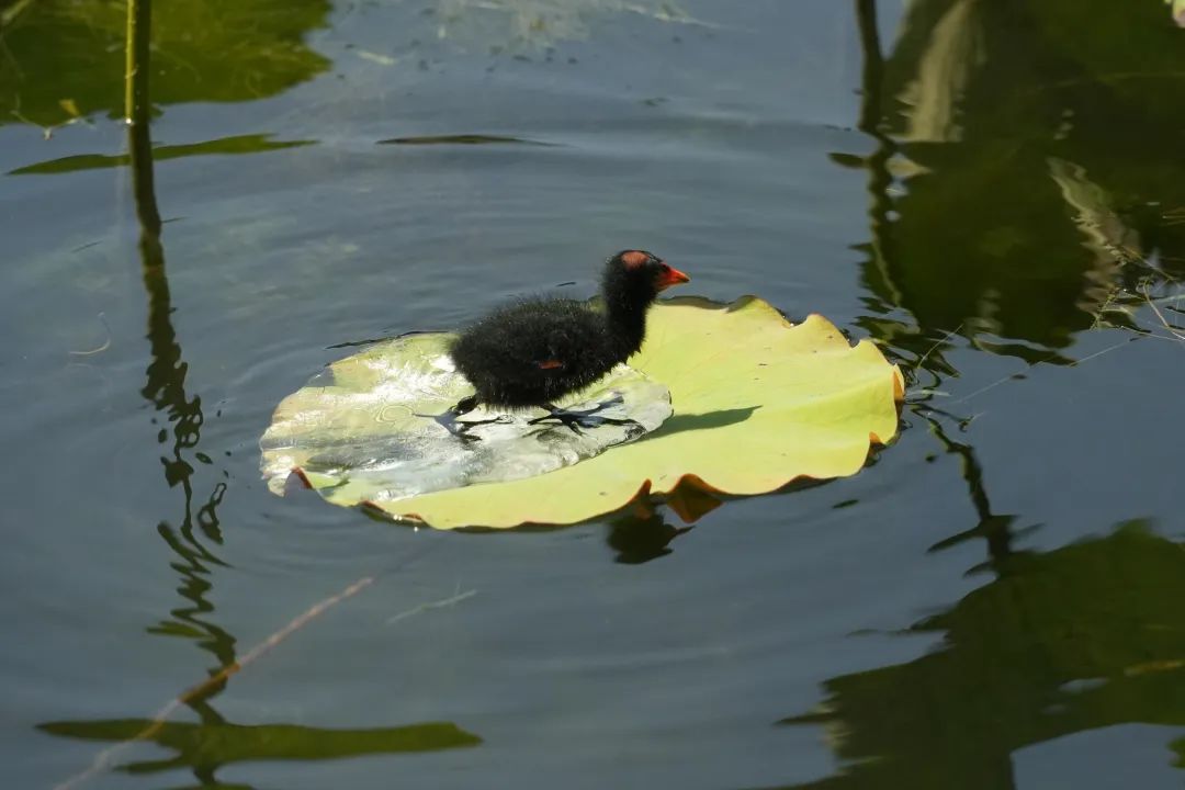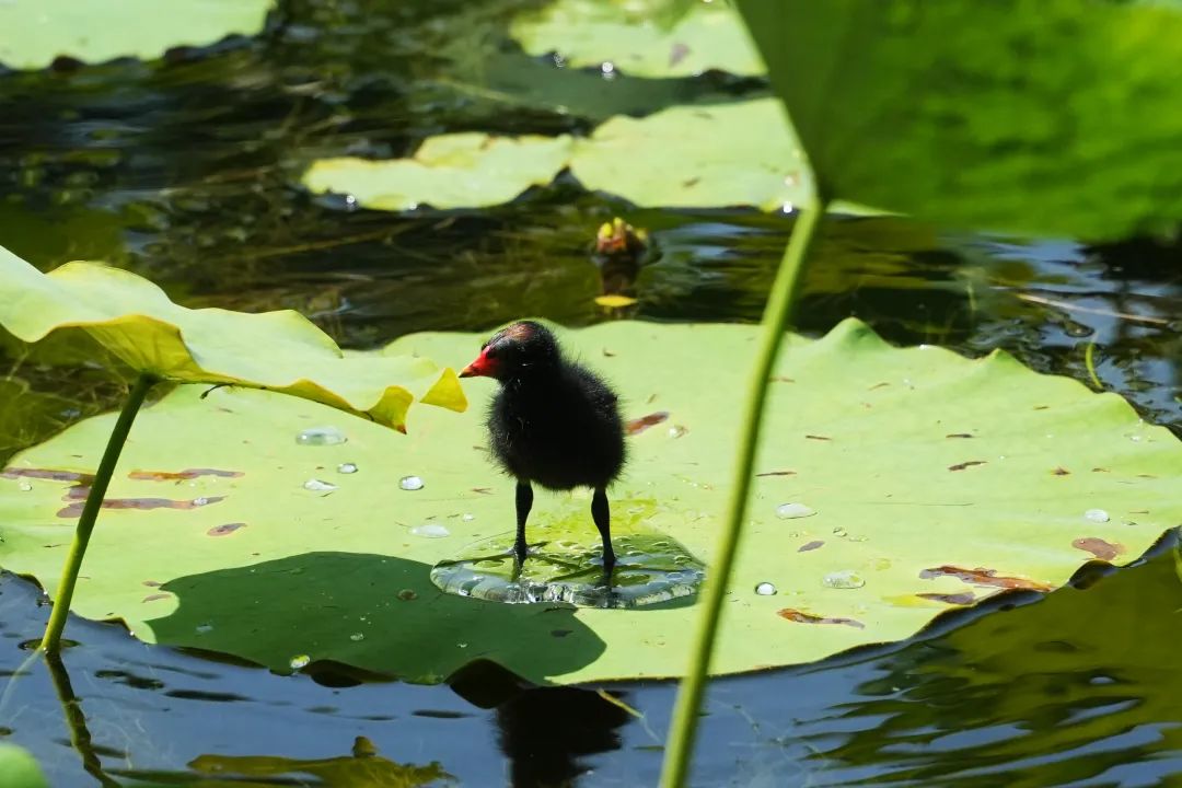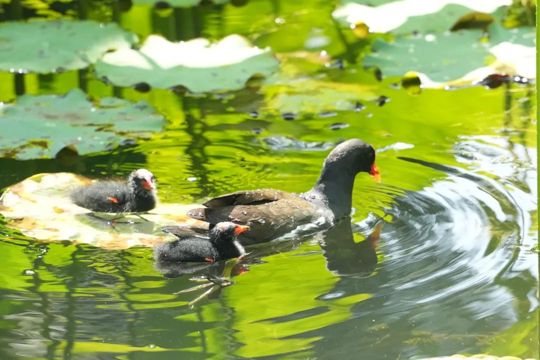 园内丰富的水生花卉为黑水鸡提供了理想的生活和繁殖环境,莲花等水生花卉分散在其中,其茂密的枝叶成为天然屏障,有效降低了天敌对黑水鸡的威胁,为黑水鸡建造巢穴提供了理想的材料。黑水鸡巧妙地利用荷叶和茎搭建温暖的窝,安心繁殖后代,为花园增添活力。
