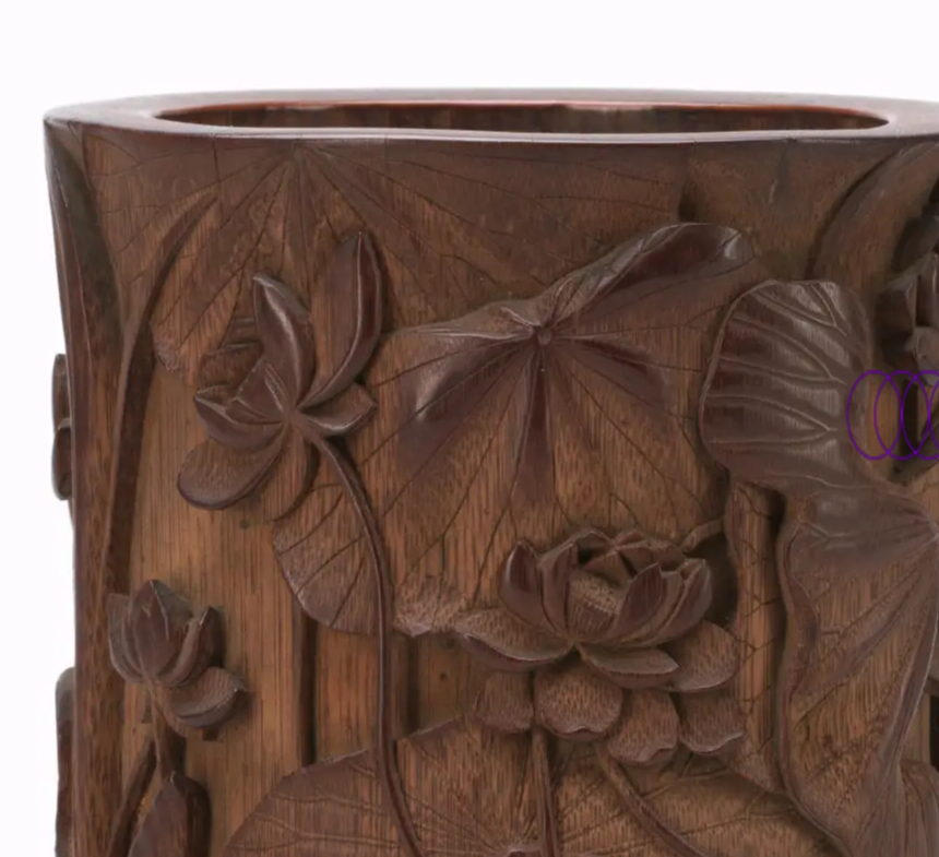 竹雕荷塘小景图笔筒局部