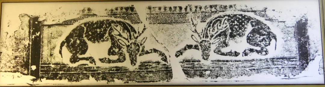 山东画像石中的两只鹿对着头躺着。