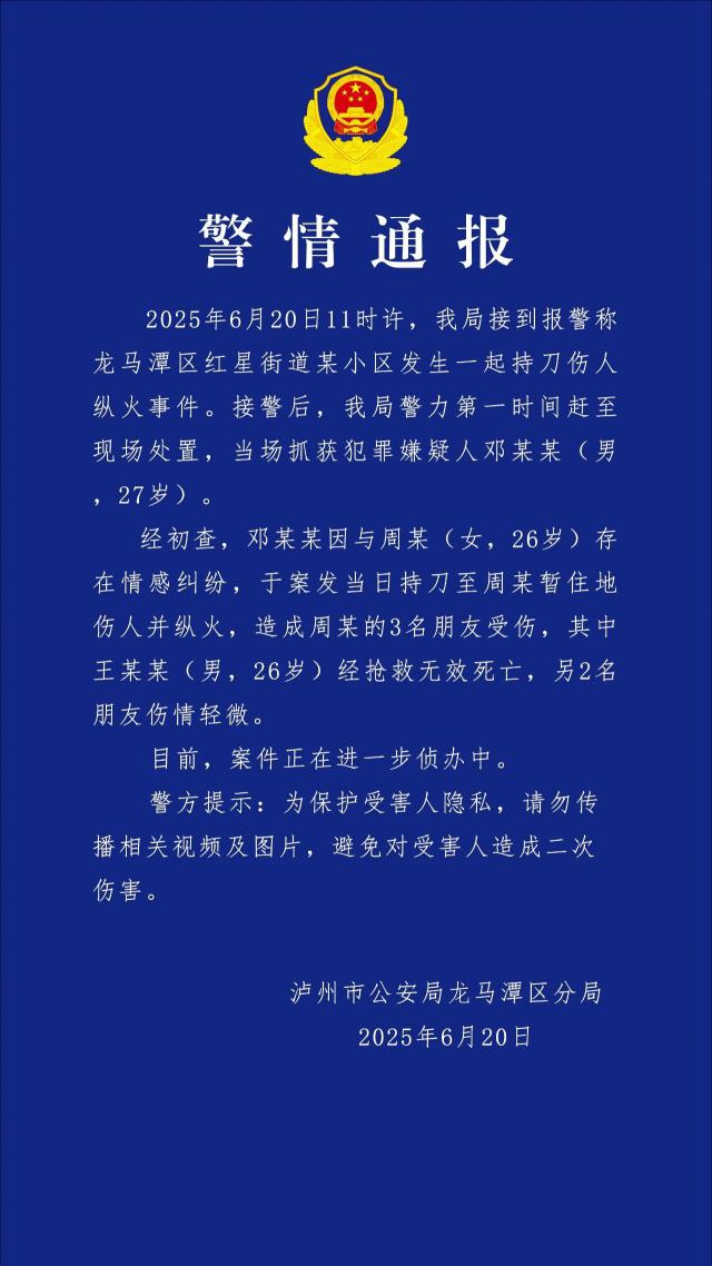 2025 年 6 月 20 日 11 当时,我局接到报警称,龙马潭区红星街某小区发生持刀伤人放火事件。接到报警后,我局警力立即赶到现场处置,当场抓获犯罪嫌疑人邓某某。 ( 男,27 岁 ) 。