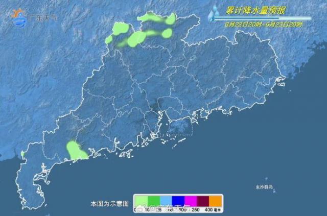 6 月 23 日本,广东省大部分市县阴天,局部有阵雨(雷)。最高气温:中北部市县 33~36 ℃;其他市县 30~33 ℃。