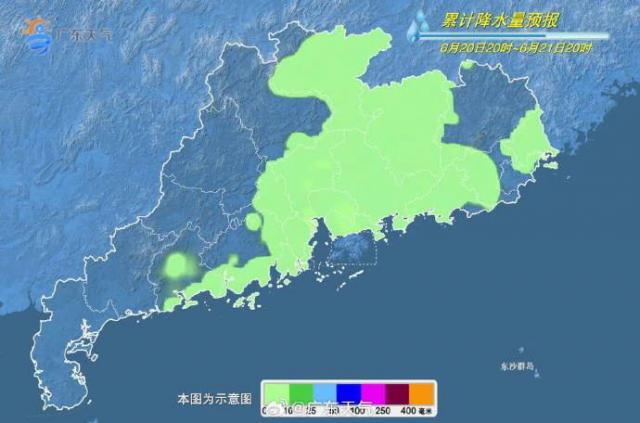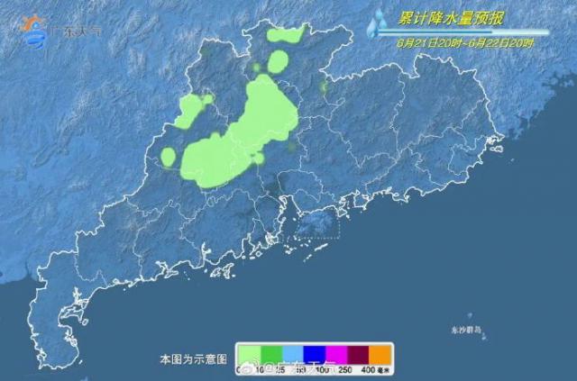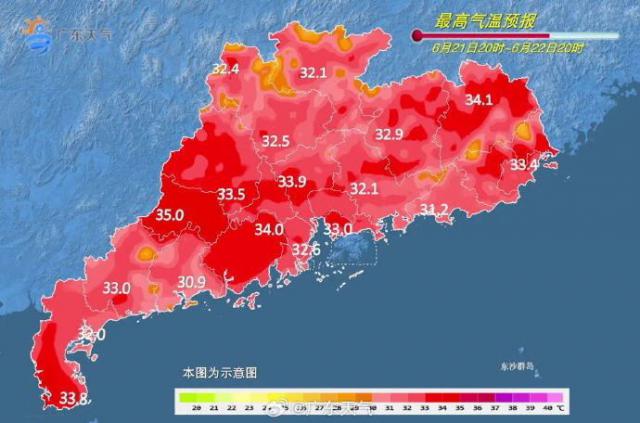 6 月 21 当天,粤西、珠江三角洲、韶关、清远市县阴天,有局部大雨或暴雨分散(雷)阵雨,其他市县阴天,局部阵雨(雷)。广东省的最高温度一般介于 31~35 ℃之间。
