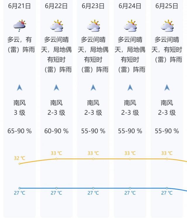 预估 6 月 21 阴天,有阵雨(雷),部分时间雨势较大,气温较高, 27~32 ℃;
